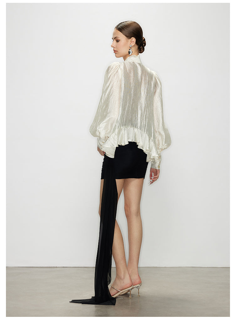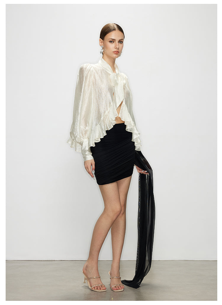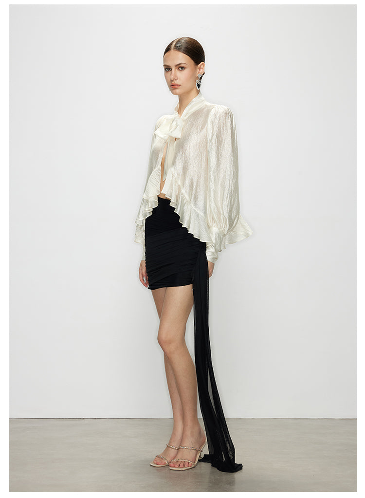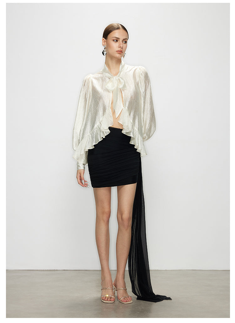 This sculpted mini skirt is crafted from stretch knit and soft mesh, designed to accentuate the body’s curves. A sheer side train flows effortlessly from the waist, merging structure with romance. The contrast of a sleek mini and a cascading tail strikes a balance of sensuality and graceful movement.