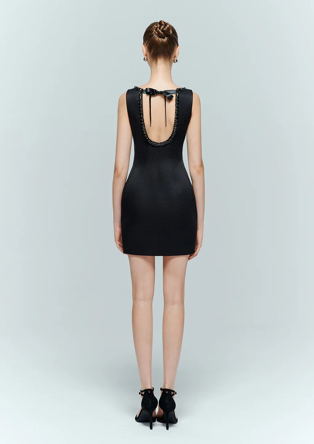 - Deep open back design — the ultimate backless black dress statement