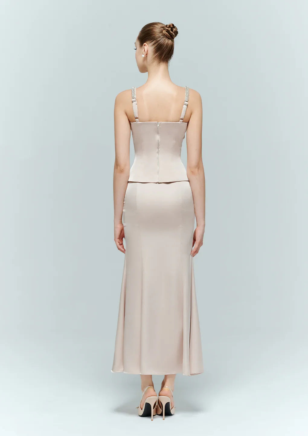 Styling Note: Create a breathtaking "Modern Ballgown" silhouette by pairing this corset with the voluminous Dahlia Maxi Skirt. The contrast between the sleek satin top and the flowing skirt is pure magic.