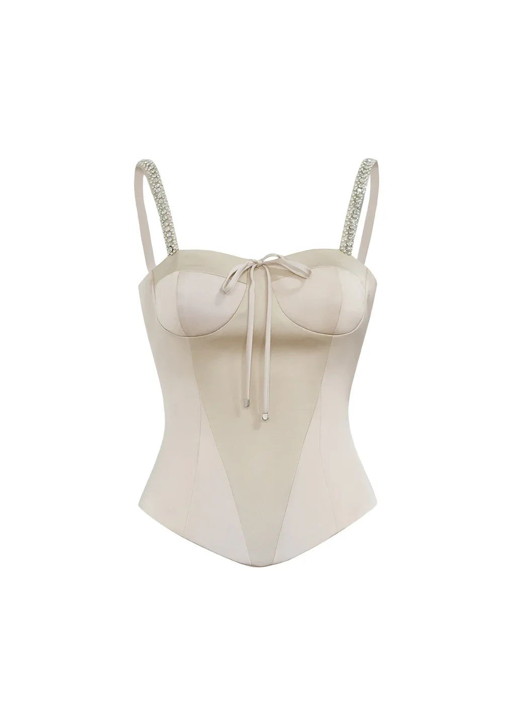 The structured silhouette provides a snatched waist, while the delicate crystal straps add a touch of jewelry-like sparkle to the shoulders. It strikes the perfect balance between "Balletcore" delicacy and modern architectural design. Whether worn for a birthday dinner or a summer soirée, the Papillon proves that a light pink corset top can be the most powerful piece in your wardrobe.