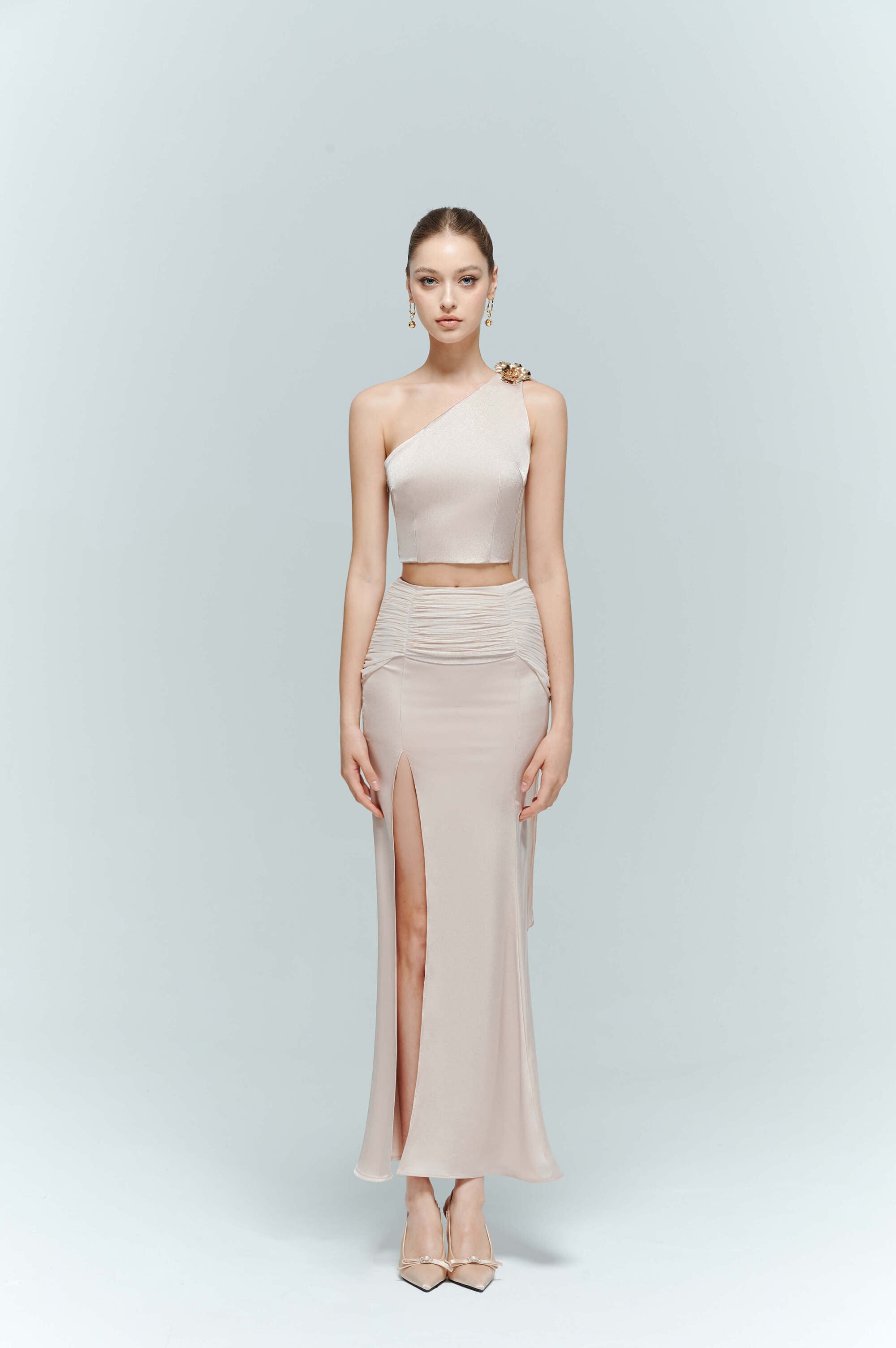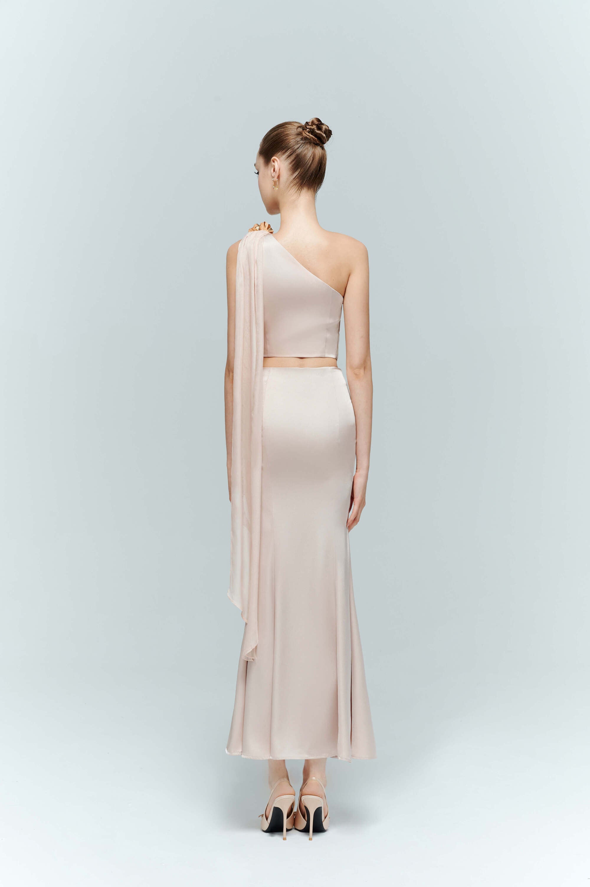 A striking one-shoulder silhouette defines the Seraphine Pink Top, blending ethereal charm with minimalist elegance. The unique cut of this asymmetrical top creates sculptural lines, while the lustrous satin fabric drapes fluidly over the body, catching the natural light of a garden wedding or the celebratory glow of a milestone event.